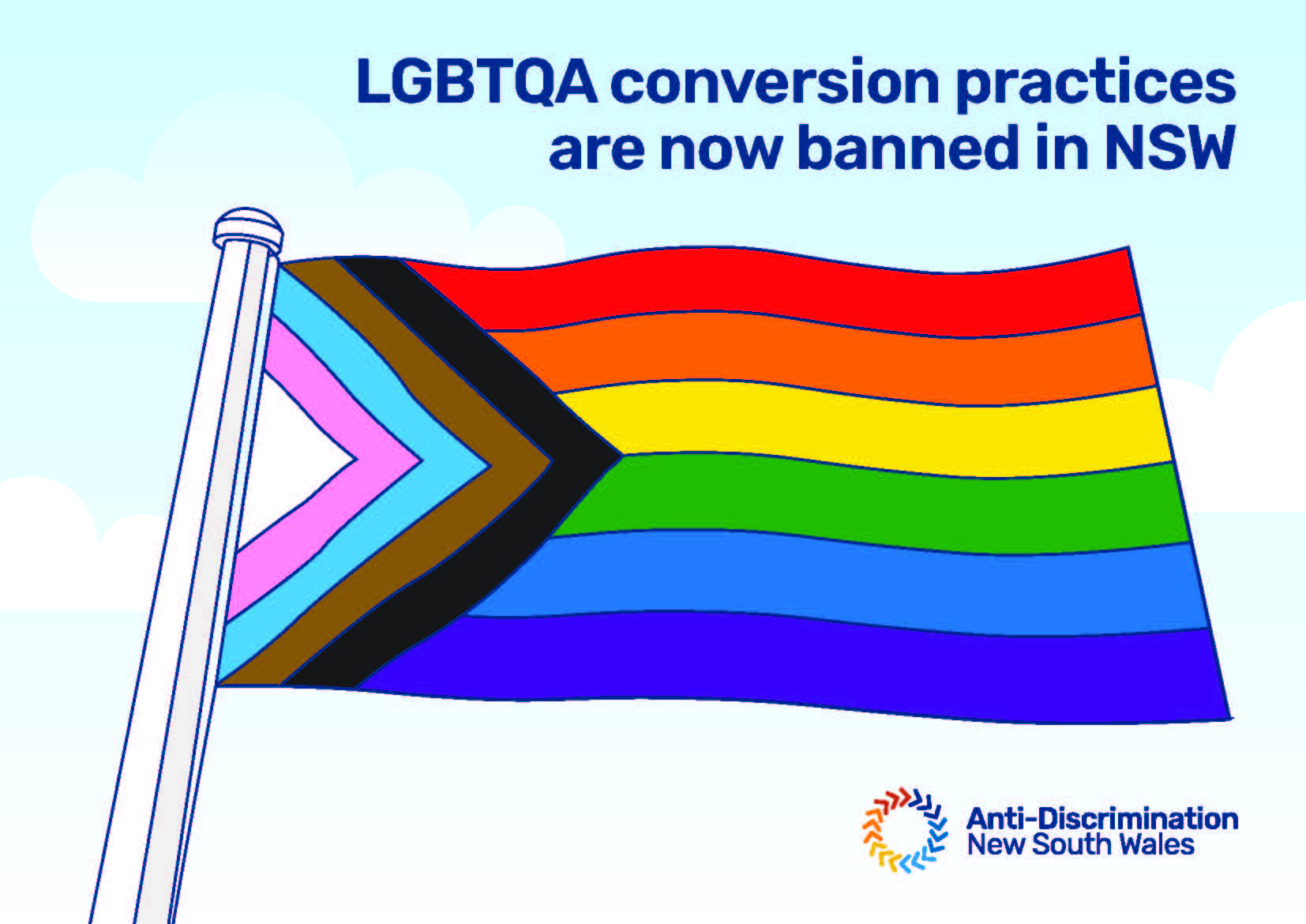A double-side A5 postcard containing information about the new LGBTQA conversion practices ban.