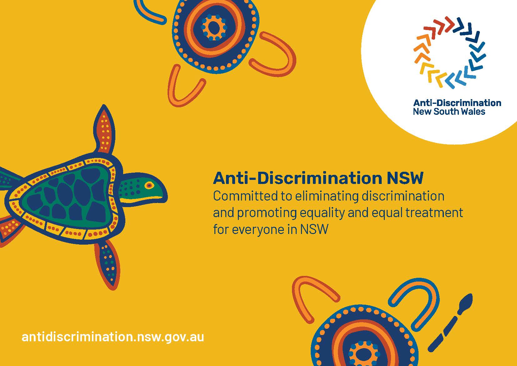 A double-side A5 postcard containing general information about Anti-Discrimination NSW.