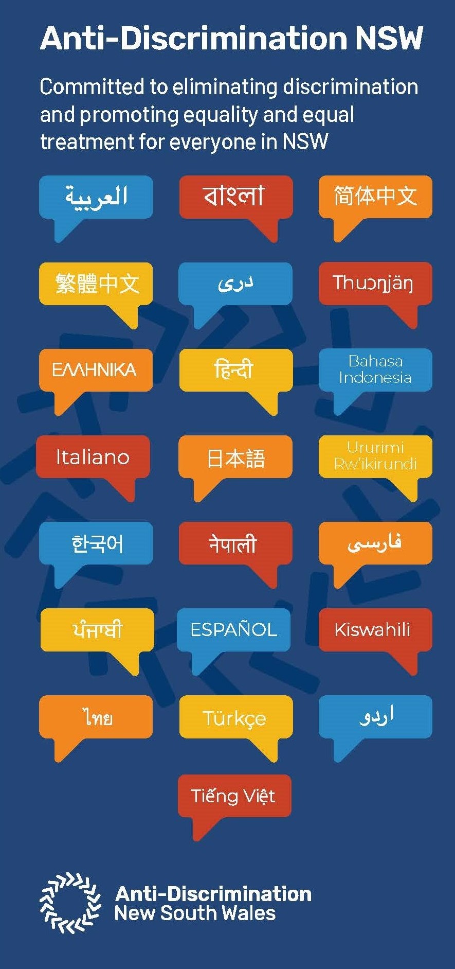 An easy to read, fold out brochure containing information about Anti-Discrimination NSW services translated into 22 community languages.